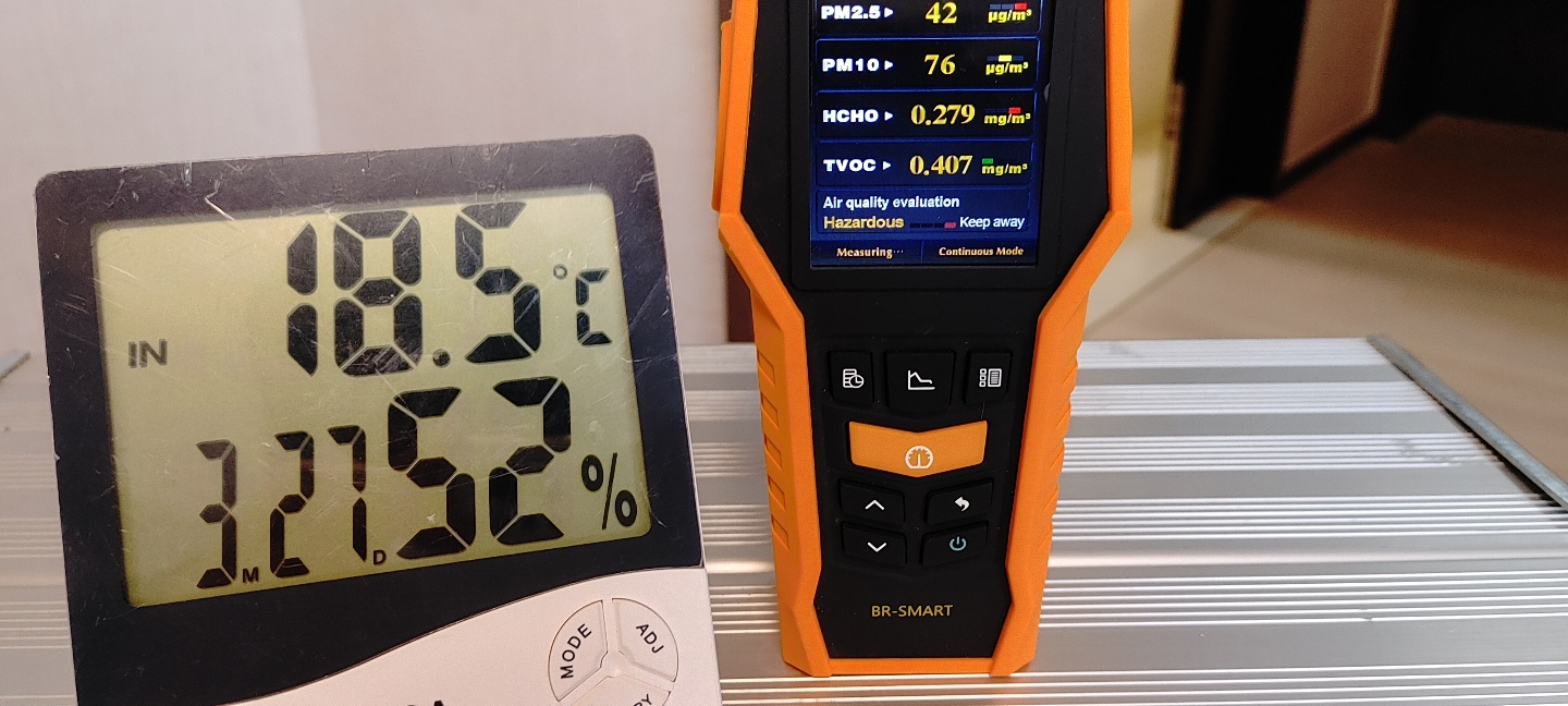 오른쪽은 초미세먼지, 미세먼지, 포름알데히드, 유기화합물 농도 수치라고 합니다. 청소한다고 오전내내 환기한 상태..